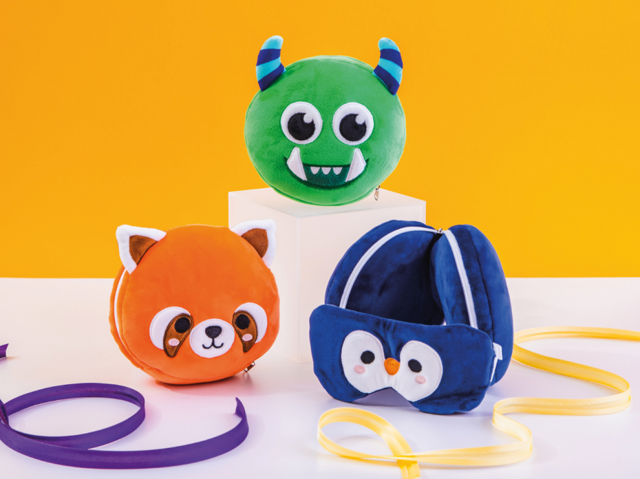 Travel size plush cushions that open to reveal a pillow and attached eye mask. Made from high quality memory foam. Fits both children and adults. Compact