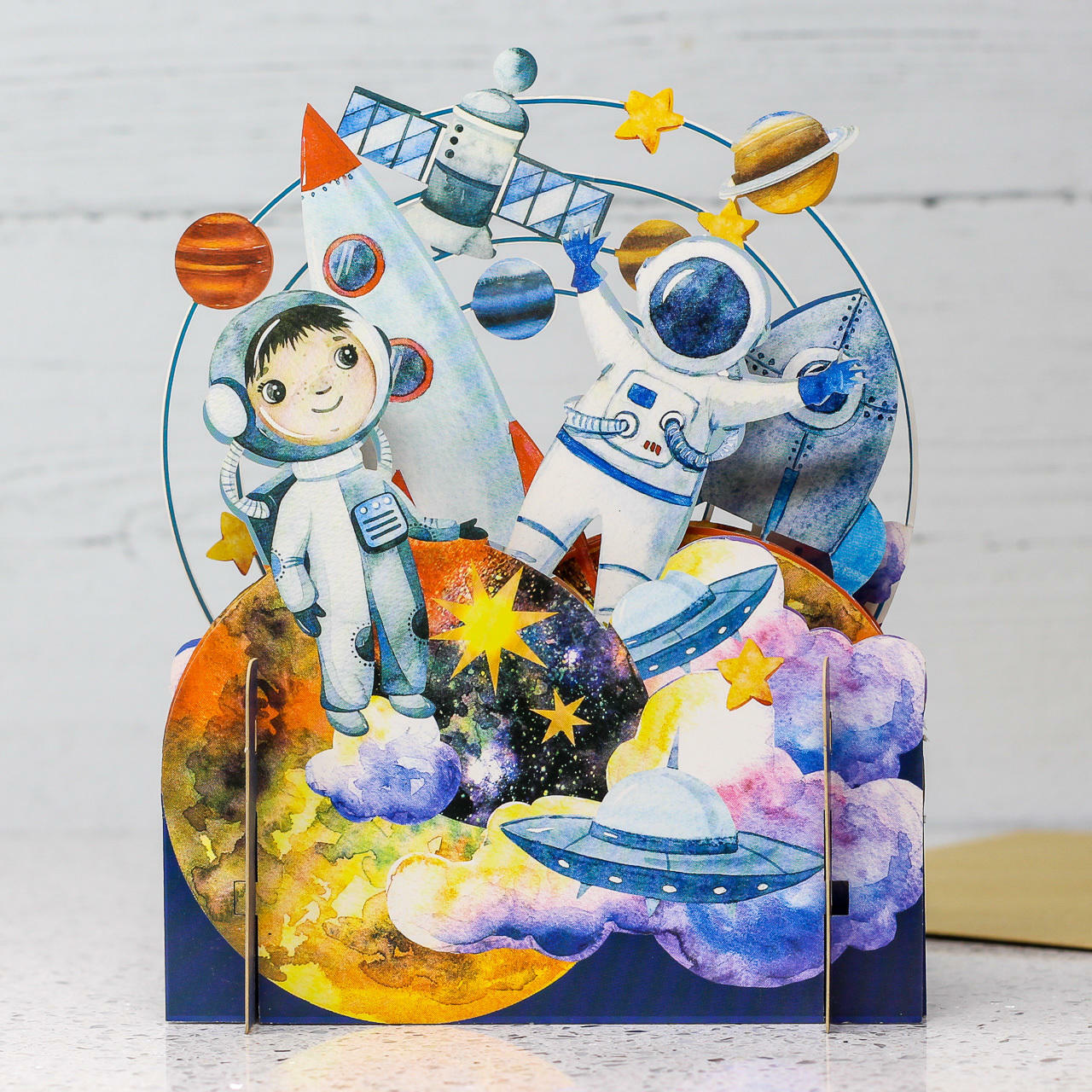 3d pop up children’s card comes flat with an envelope. You can write your message on the back of the card. The card easily unfold to create the 3D look. The cards are printed and created in Ireland