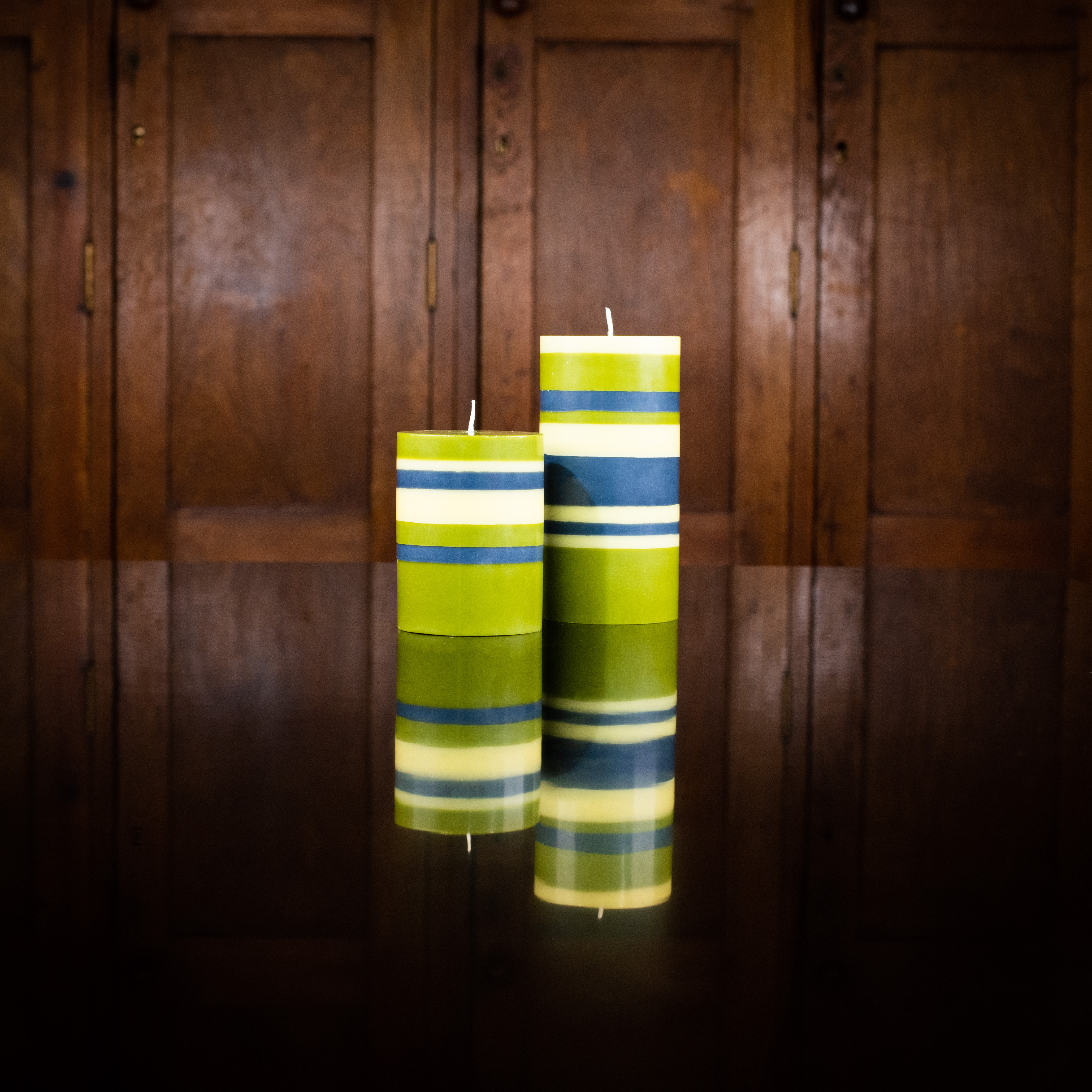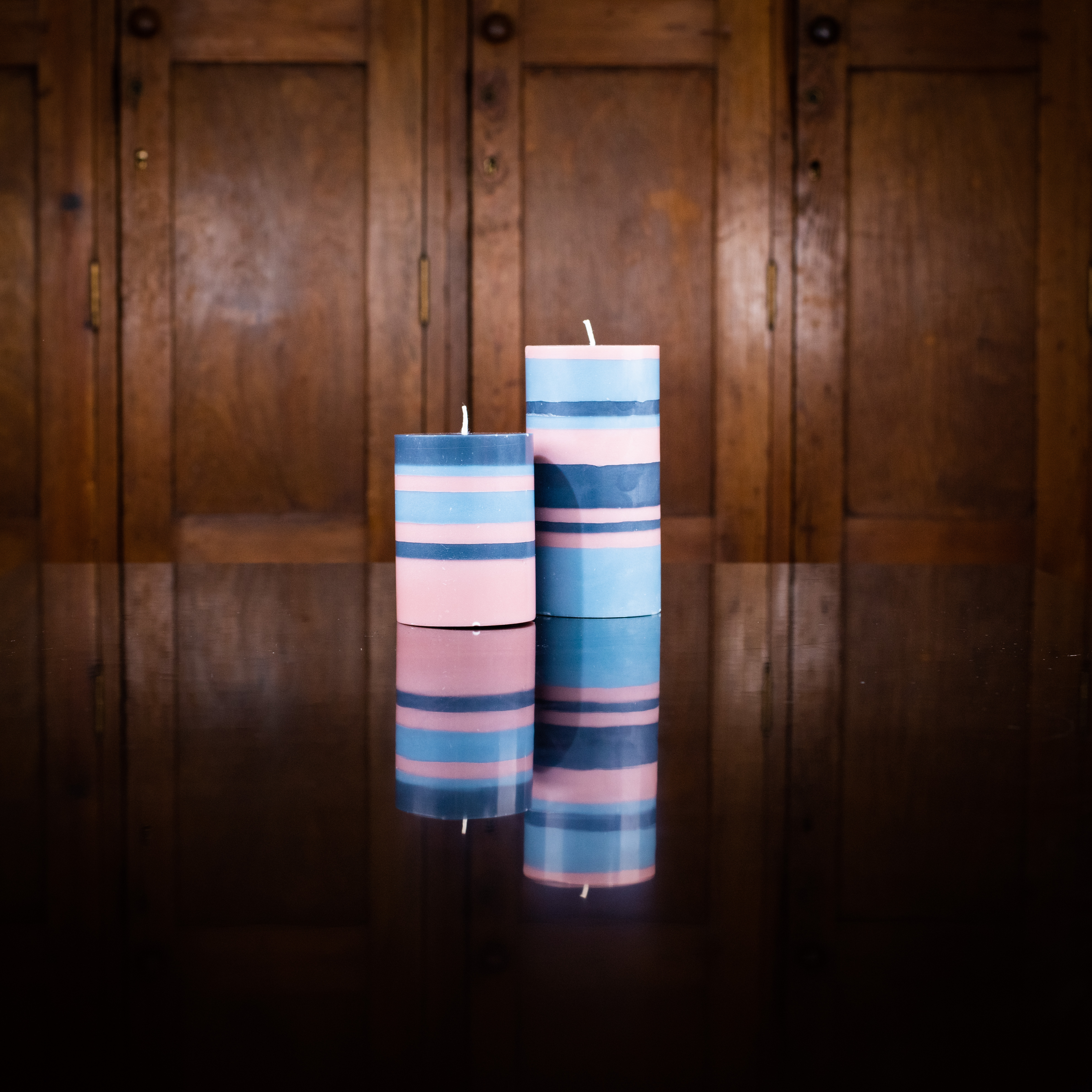 Hand poured pillar candles, in bold bands of archive BRITISH COLOUR STANDARD colours. These unique striped, pillar candles make a wonderful gift, individually boxed in a Kraft Card (easily recycled) box.