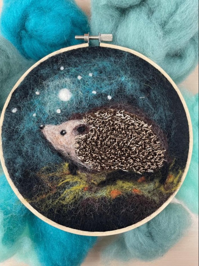 Your Hedgehog in a Hoop Needle Felting Craft Kit contains: 100% Corriedale wool, wool mix felt fabric, top quality German felting needles, 15cm embroidery hoop, a recycled foam mat to work on, chalk, full colour instructions.