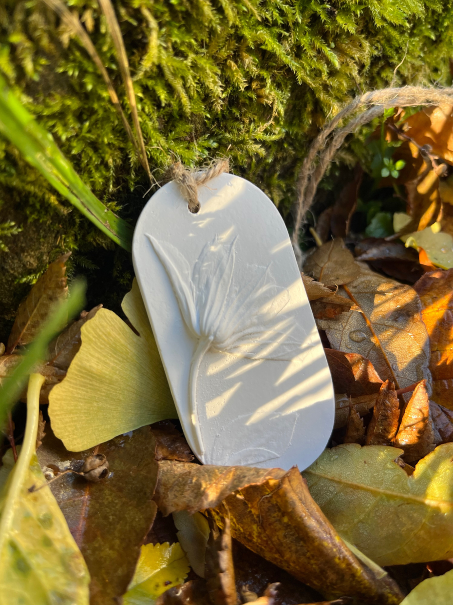 Each Botanical Cast Car Freshener is cast by hand from the real plants and flowers we grow in Lincolnshire. The designs capture all of the intricate and beautiful detail of each plant and flower showing the creases in each petal and vein of each leaf. The fresheners are infused with your choice of fragrance oil from the selection of over 10 gorgeous scents. Simply remove from its compostable packaging and hang in you car. Where it will release it lovely fragrance. Once the scent starts to fade simply add a few drops of the fragrance oil from the supplied 3ml dropper bottle. This will replenish the scent. The little bottle contains enough oil for multiple applications allowing for many weeks of gorgeous car freshness.