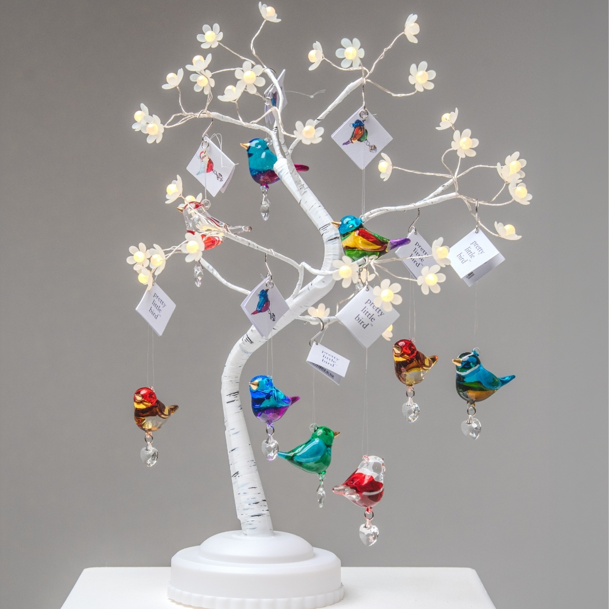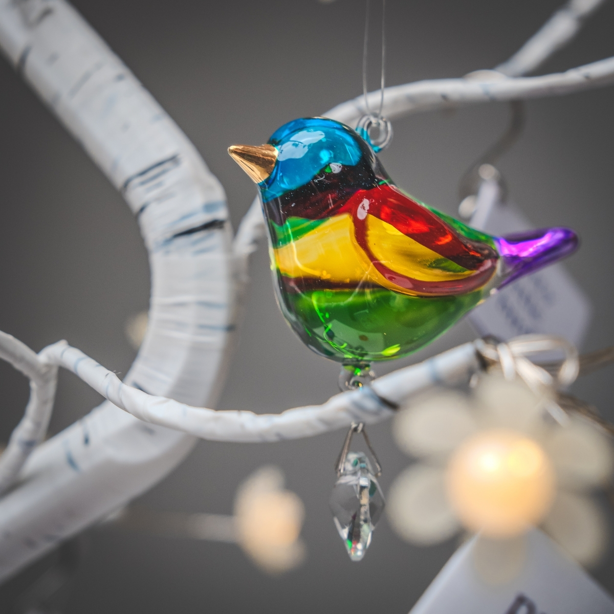 A fly away bestseller. These handmade, hand painted pretty little glass birds are embellished with a crystal heart and enhanced with 24 carat gold paint. They are individually boxed with a heartfelt sentiment assigned to each of the six designs.