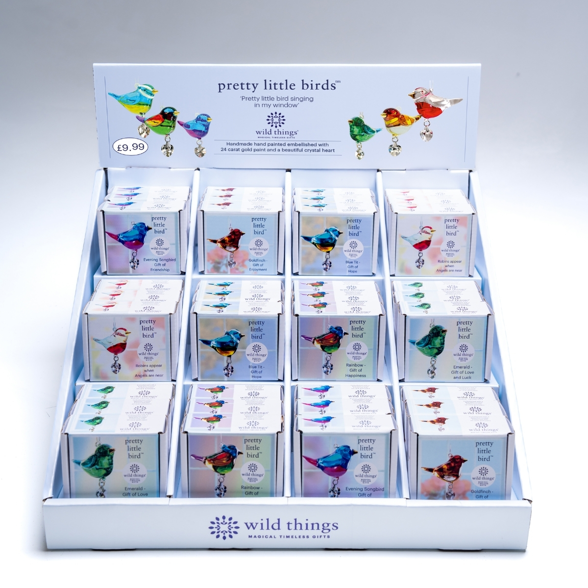Our Fantasy Glass Pretty Little Birds collection is one of our biggest success stories - the Robin design in particular is a literal fly-away bestseller. Handmade and hand painted glass birds in six designs, each are embellished with a complementary coloured crystal heart and enhanced with 24 carat gold paint. Individually boxed and sold in packs of three by design. Available in a range of attractive and functional counter top and floor spinner starter packs.