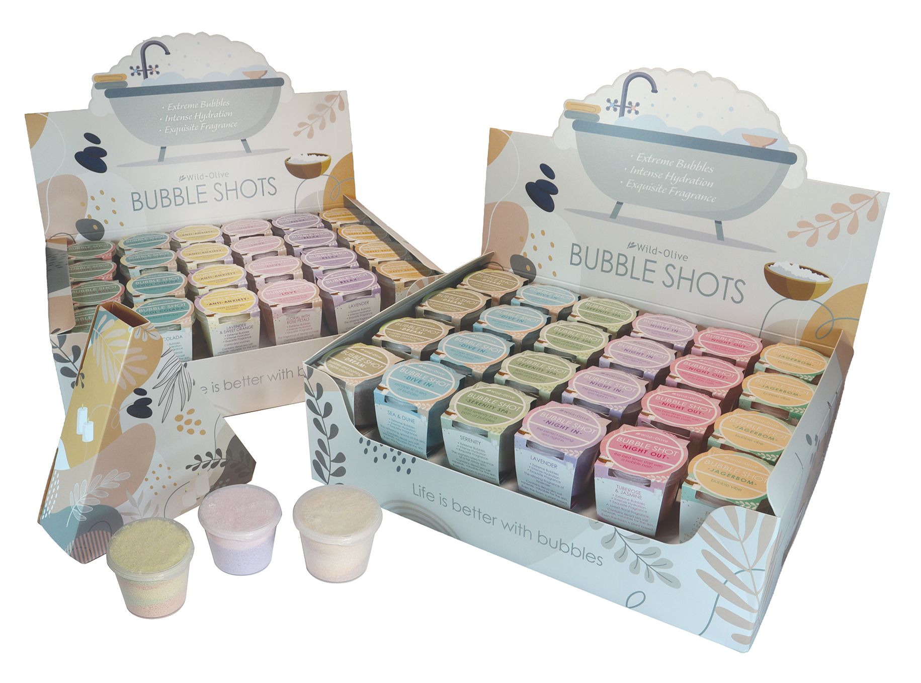 Choose from 12 vibrant “shots,” from the playful Jagerbomb to the calming Anti Anxiety, plus the perfect picks for your mood: Night In, Night Out, Happy Bathday, and our bestselling Serenity Spa. There truly is a bubble shot for everyone and every occasion.