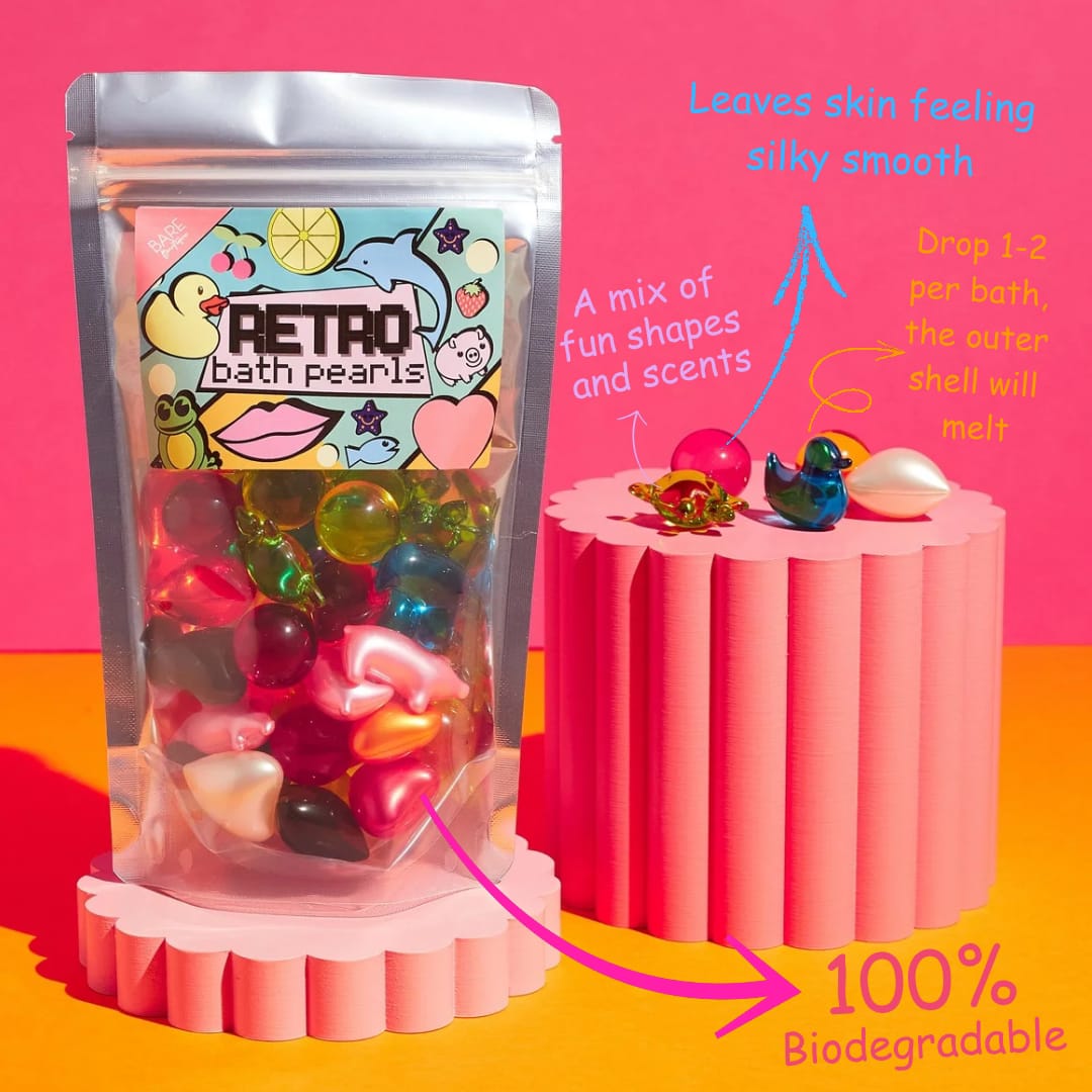 Our Retro Bath Pearl Bag celebrates everything people love about Bare Boutique’s iconic bath pearl range. Filled with a fun mix of colours, shapes, and scents—clearly listed on the back of each pack. It’s a true throwback treat designed for today’s bath lovers. Bath pearls have seen a huge revival, especially among millennials who adore the nostalgic 90s vibe, as well as a whole new generation discovering these playful, melt-into-oil pearls for the first time.