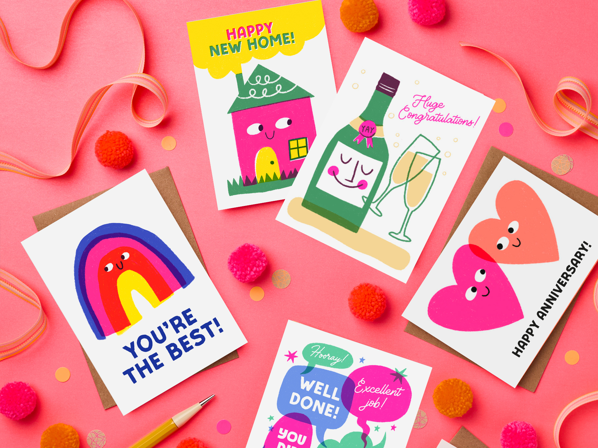 We knew we wanted to create a tactile letterpress product which exuded high quality on to lovely board that you can't stop running your fingers over - but we still wanted it to be fun! Think eye-popping flouro colours, plenty of character and contemporary illustration... all printed on a traditional heidleberg press. Each card is a beautiful, tangible piece of sentiment that the recipient will treasure.