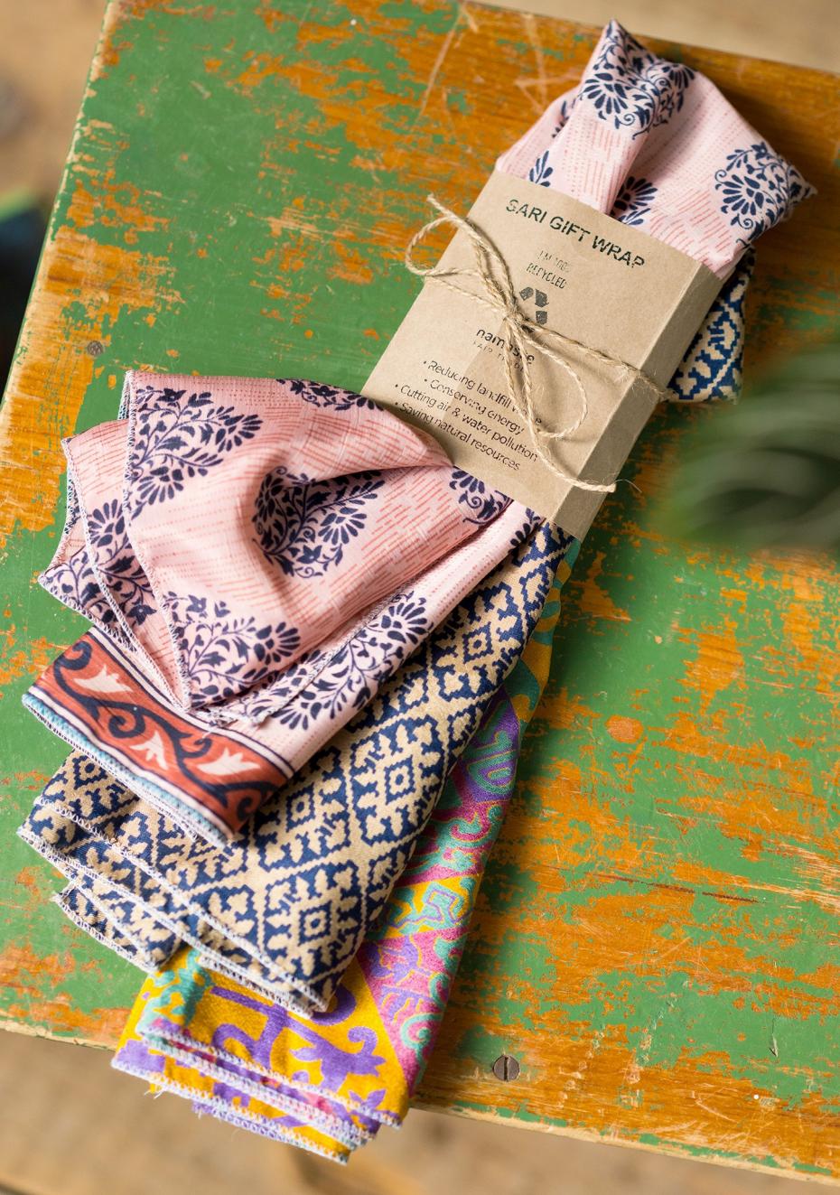 Each set of 4 different designs are created from colourful, upcycled sari fabrics, breathing new life into textiles that would otherwise go to waste. With neat stitching and vivid patterns, no two wraps are ever the same and make every gift feel truly special inside and out.