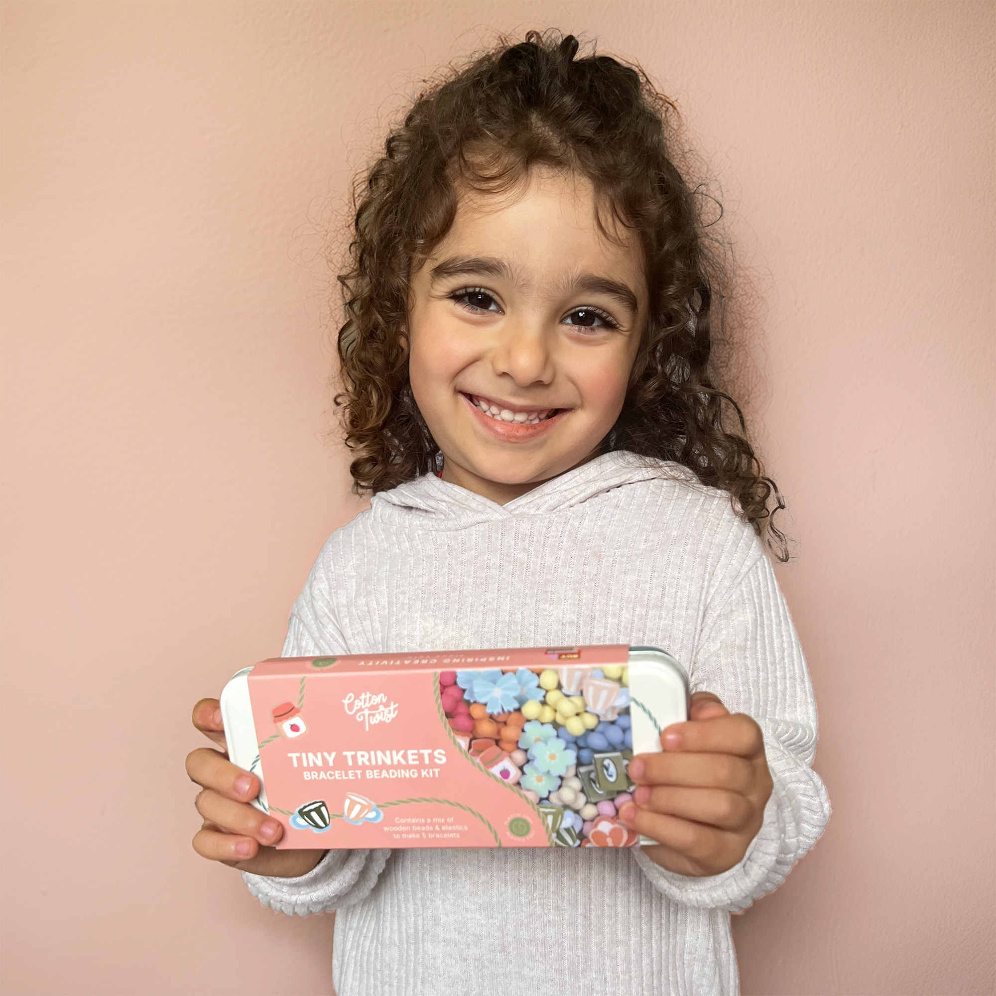 The Tiny Trinkets Beading Kit is a gentle, nostalgic crafting experience inspired by the soft, charming aesthetics of cottagecore and the joy of collecting tiny treasures. Designed to encourage calm, mindful creativity, the kit invites children to combine a curated selection of wooden beads in delicate tones to make their own trinket-style jewellery pieces.
