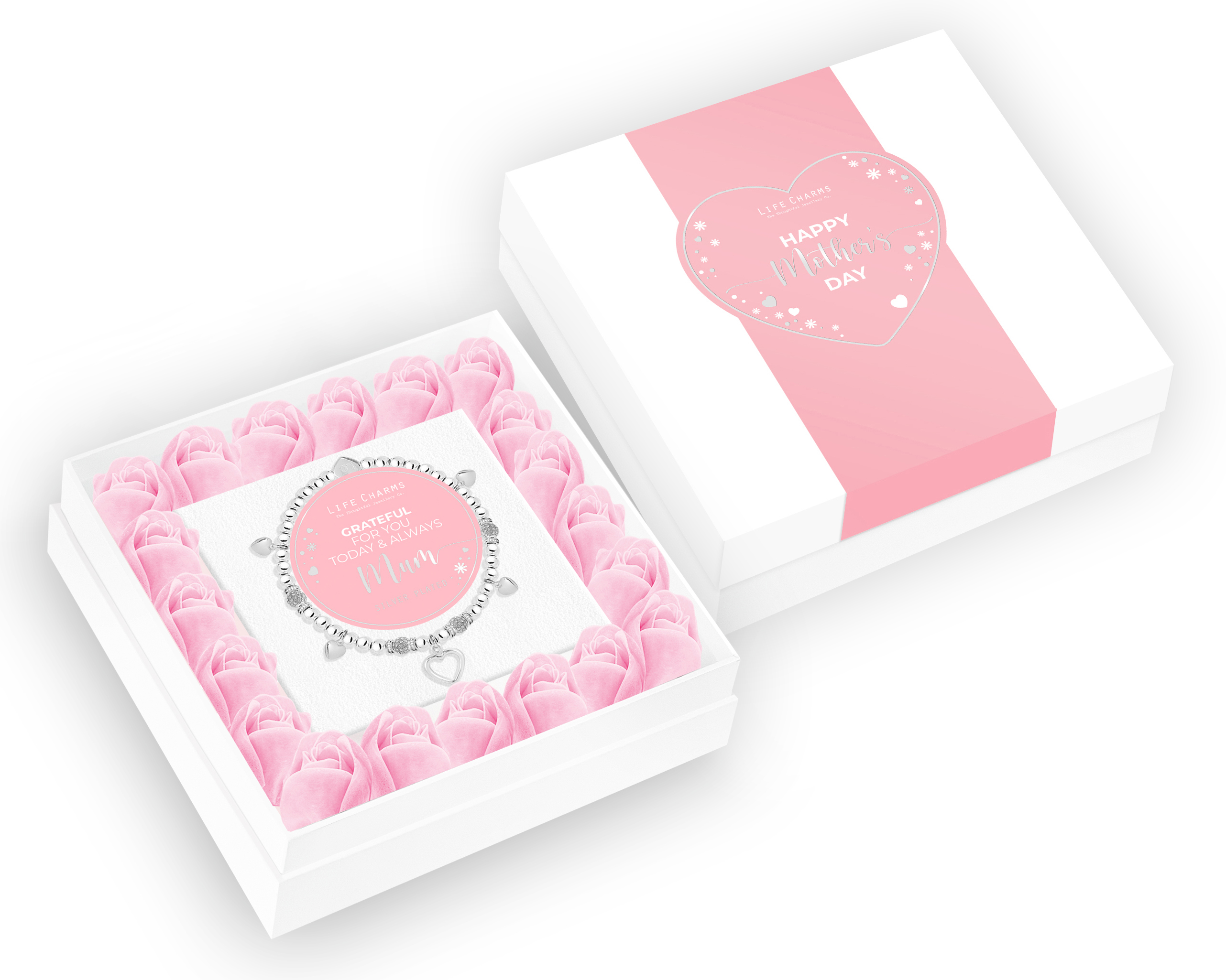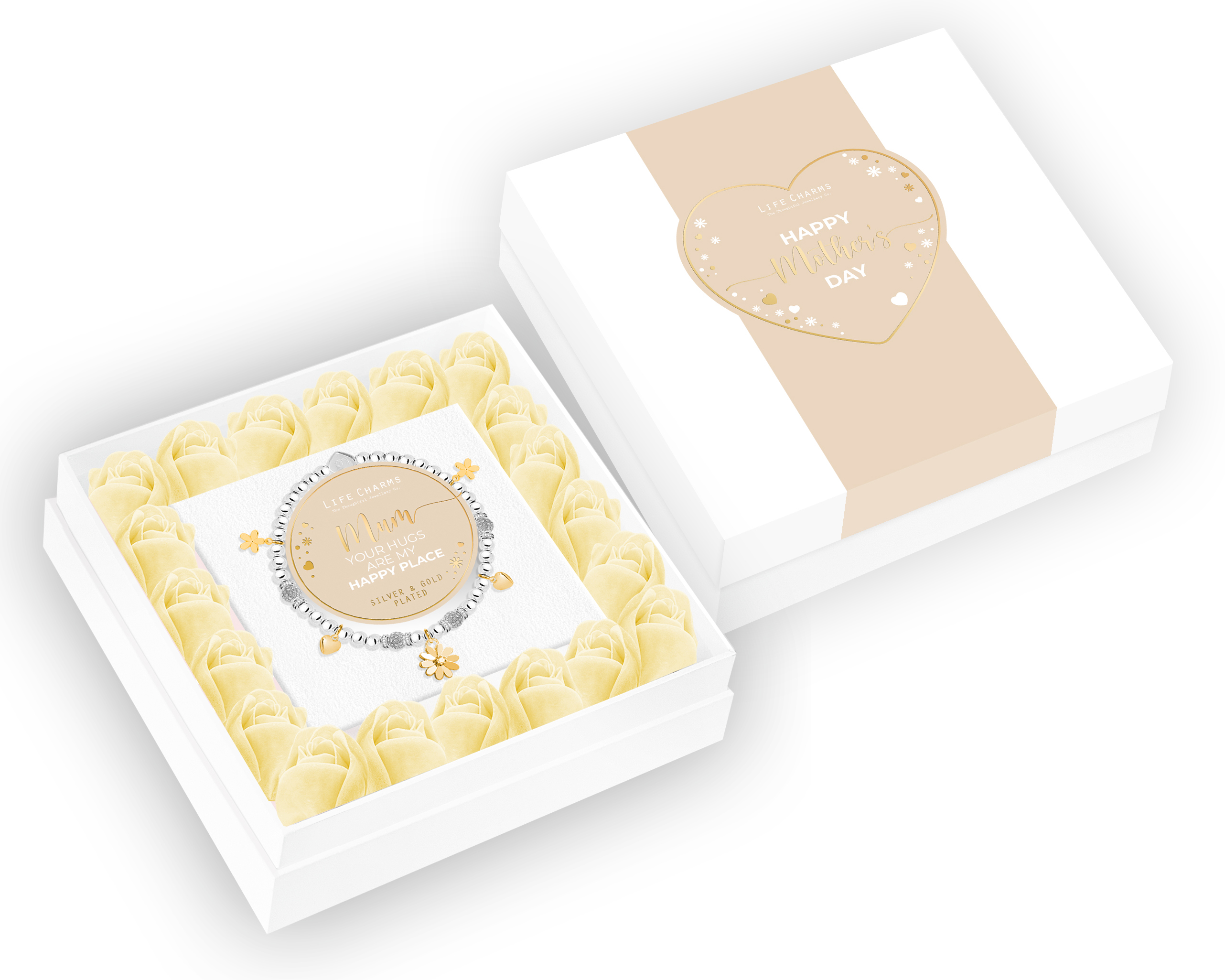 Surprise your Mum with a luxury gift box filled with floral arrangement and a bracelet decorated with five thoughtfully crafted charms. Wrapped in