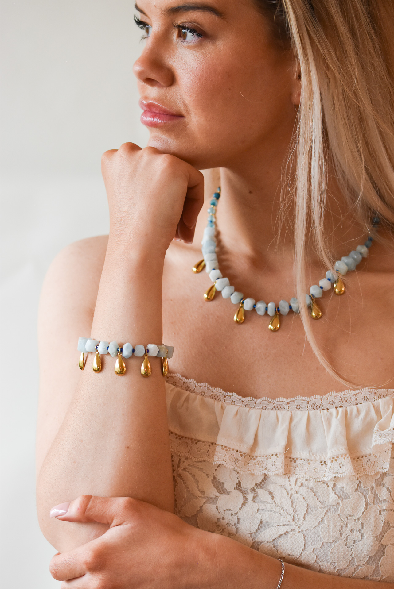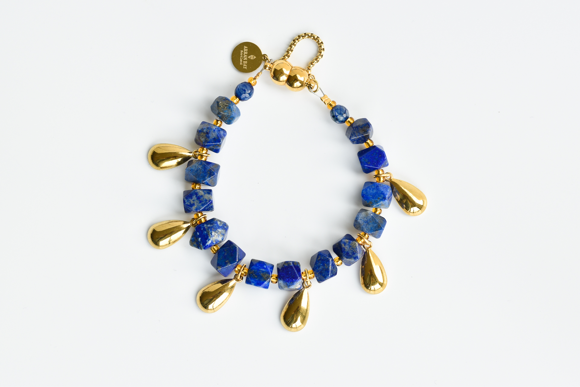 Lapis lazuli and aquamarine natural gemstones alongside stainless steel teardrop drops plated in 18k gold. Stainless steel magnetic clasps plated with 18k gold plate. Stainless steel gold plate tags and safety chains on the bracelets.