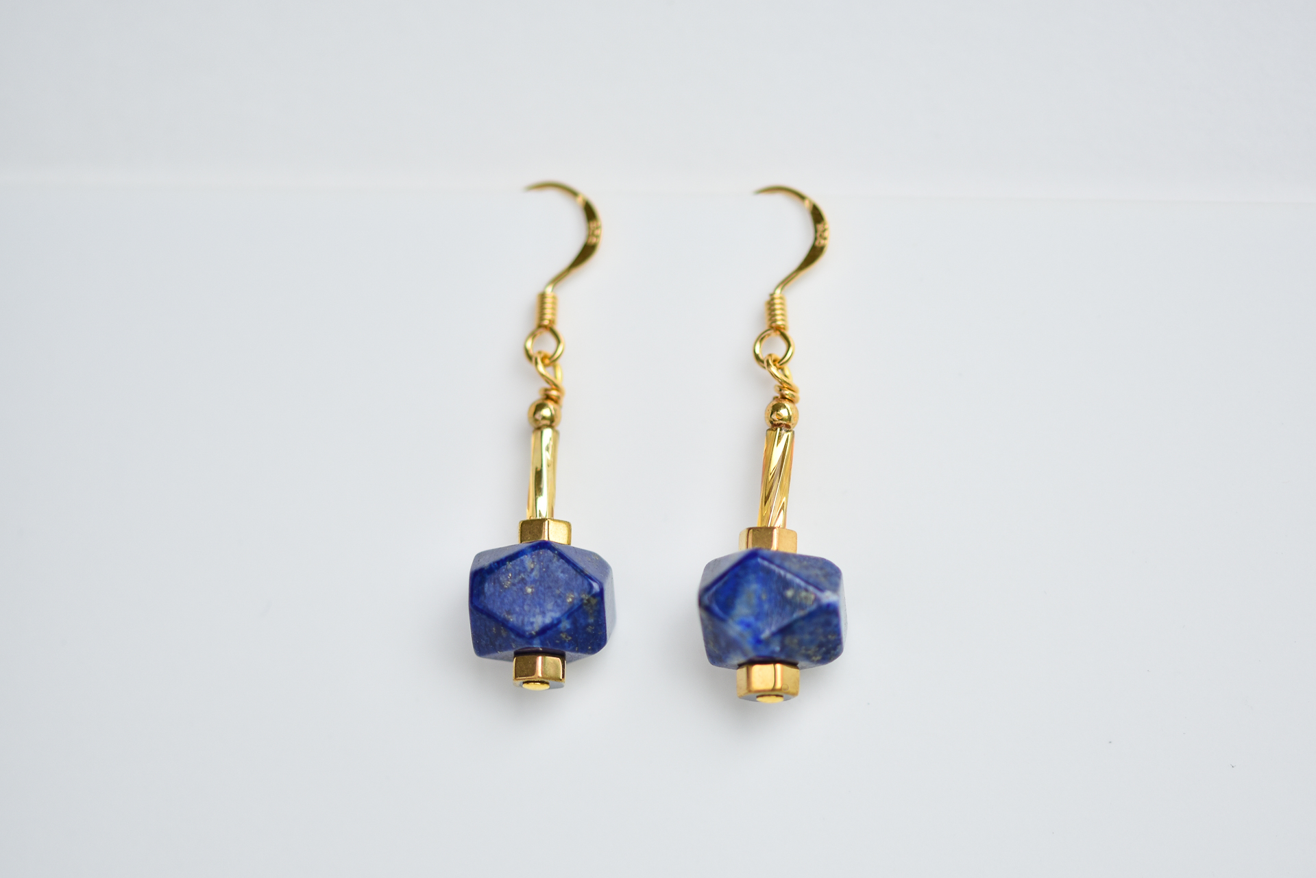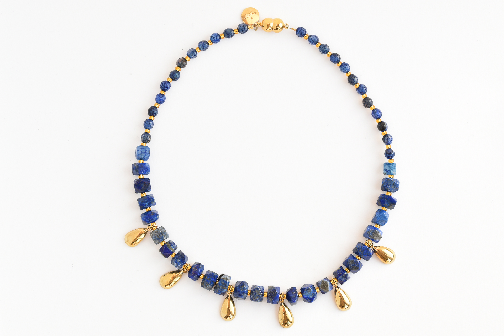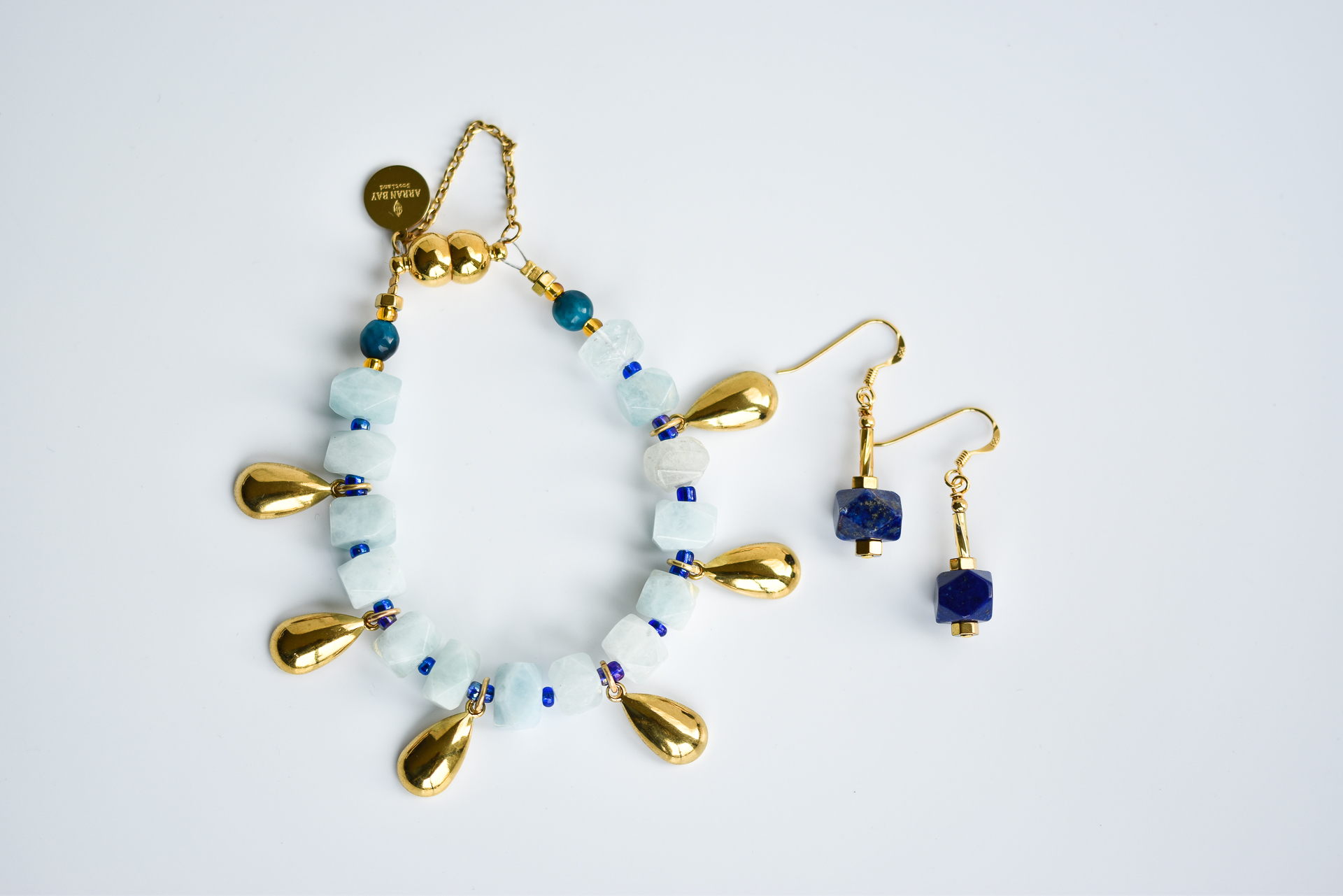 The Petal & Stone collection pairs natural lapis lazuli and aquamarine gemstones with sleek 18k gold-plated steel drops, balancing natural texture with clean, modern shine.