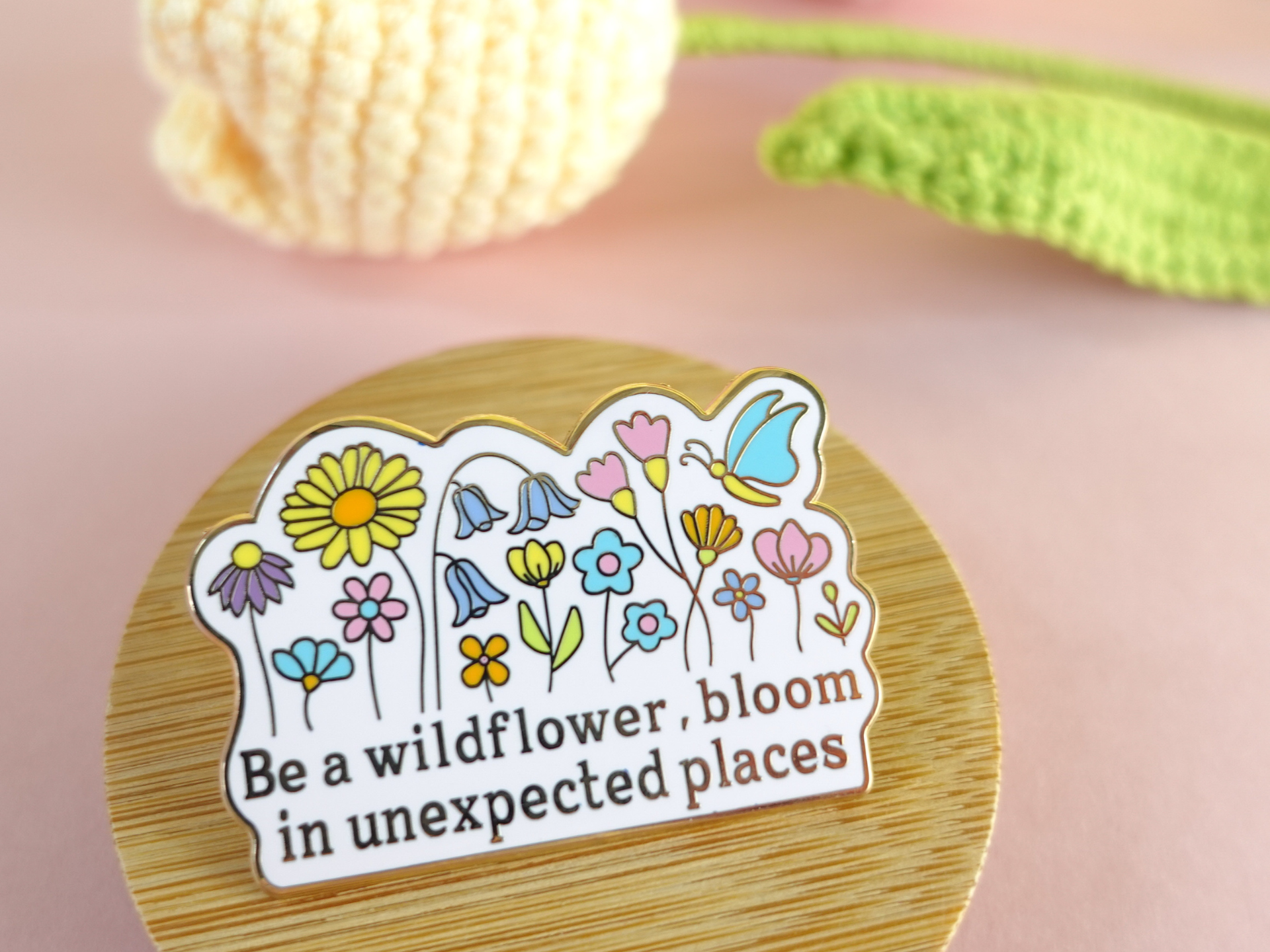 The Be a Wildflower Pin: A delicate floral design carrying an uplifting quote to symbolise strength and resilience.
