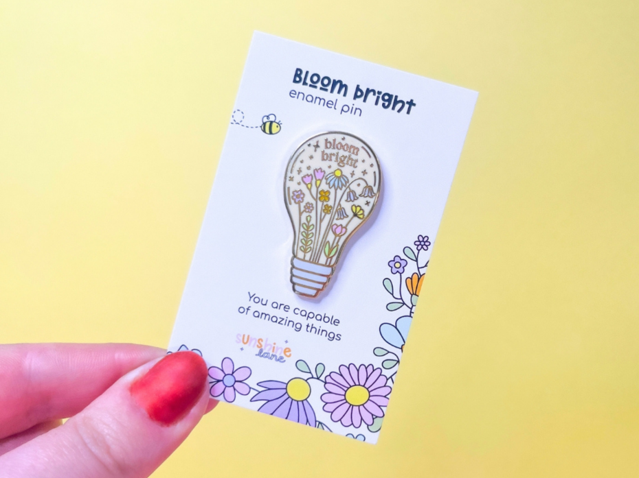 The Bloom Bright Pin: A creative design featuring a lightbulb blooming with wildflowers, symbolising inner strength and potential.