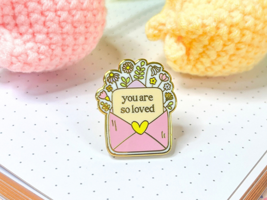 The You Are So Loved Pin: A charming open envelope, adorned with wildflowers, that delivers the heartfelt message, "You are so loved," reminding the wearer how cherished they are.