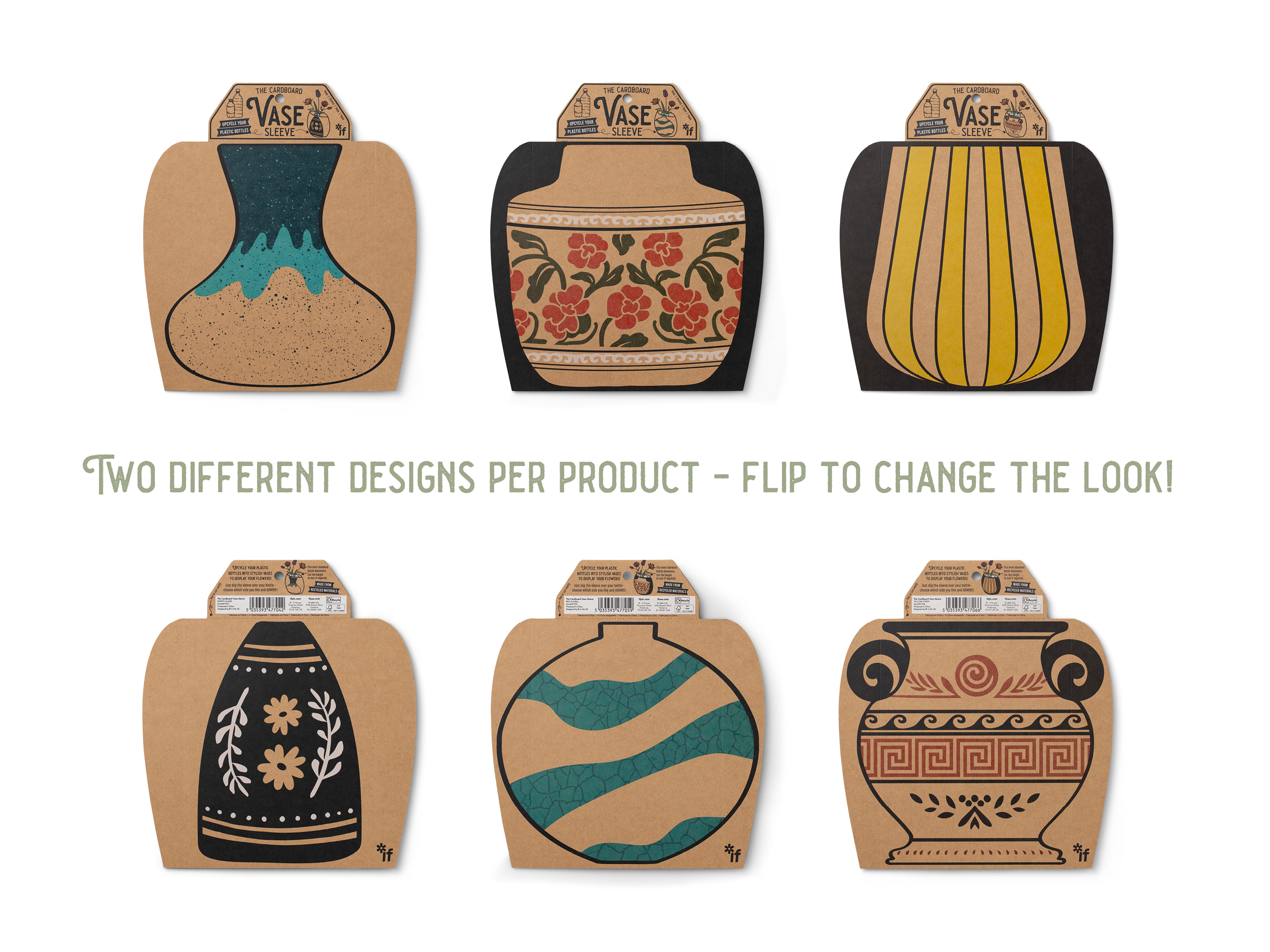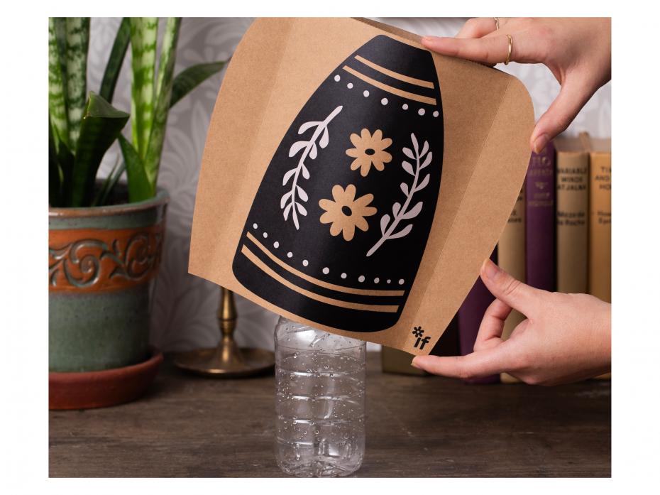 It is just that - a sleeve that fits over your empty plastic bottles and instantly transforms them into really cool vases to display your flowers. Generously we have given you one design on each side, so you can spin the sleeve and ring the changes! Simply choose your bottle - anything from a small 250ml water bottle with narrow neck (maybe for a single red rose?) to a 2 litre pop bottle cut down to give a wider neck for a serious bouquet! Made from recycled material and recyclable itself this is a lovely sustainable postable present. Great for garden centres, florists and stylish gift & interior stores.
