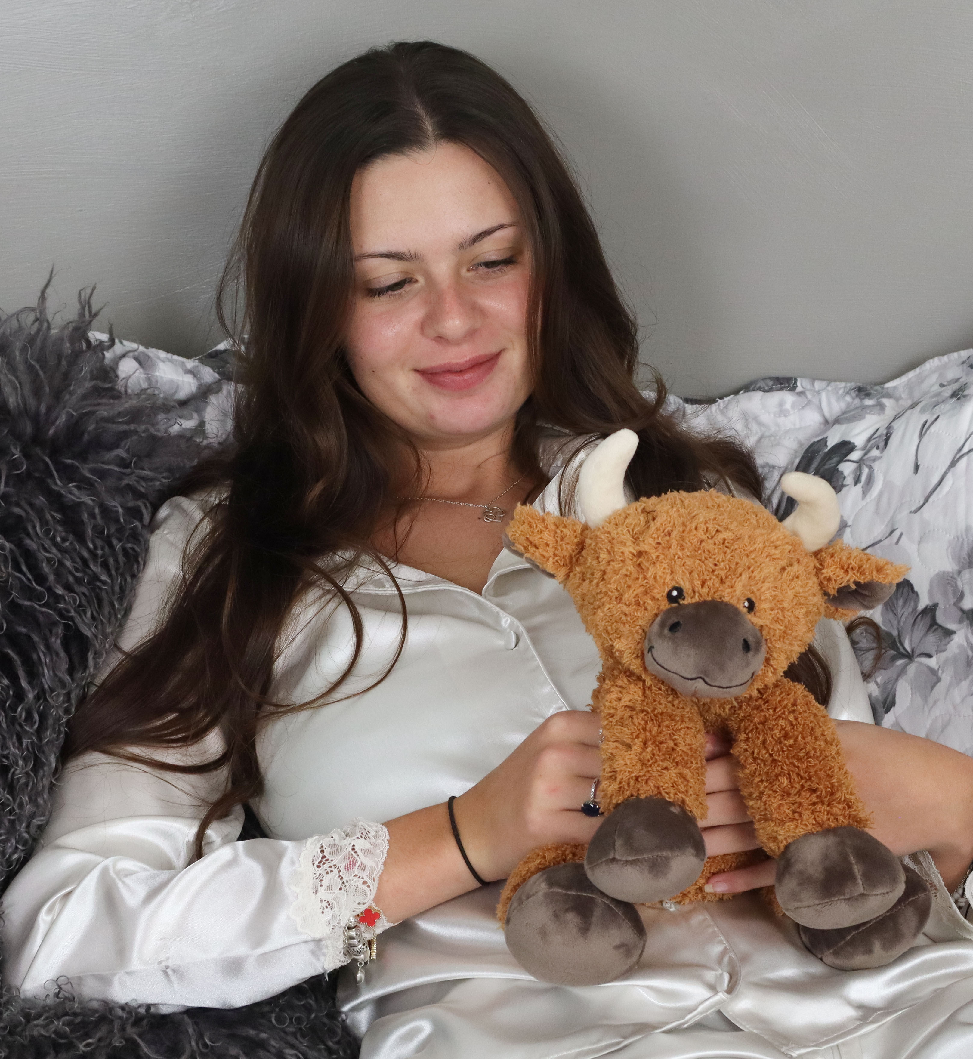 This lovable microwavable plush Highland Cow is so cute and just perfect to cuddle up with and keep warm. ​