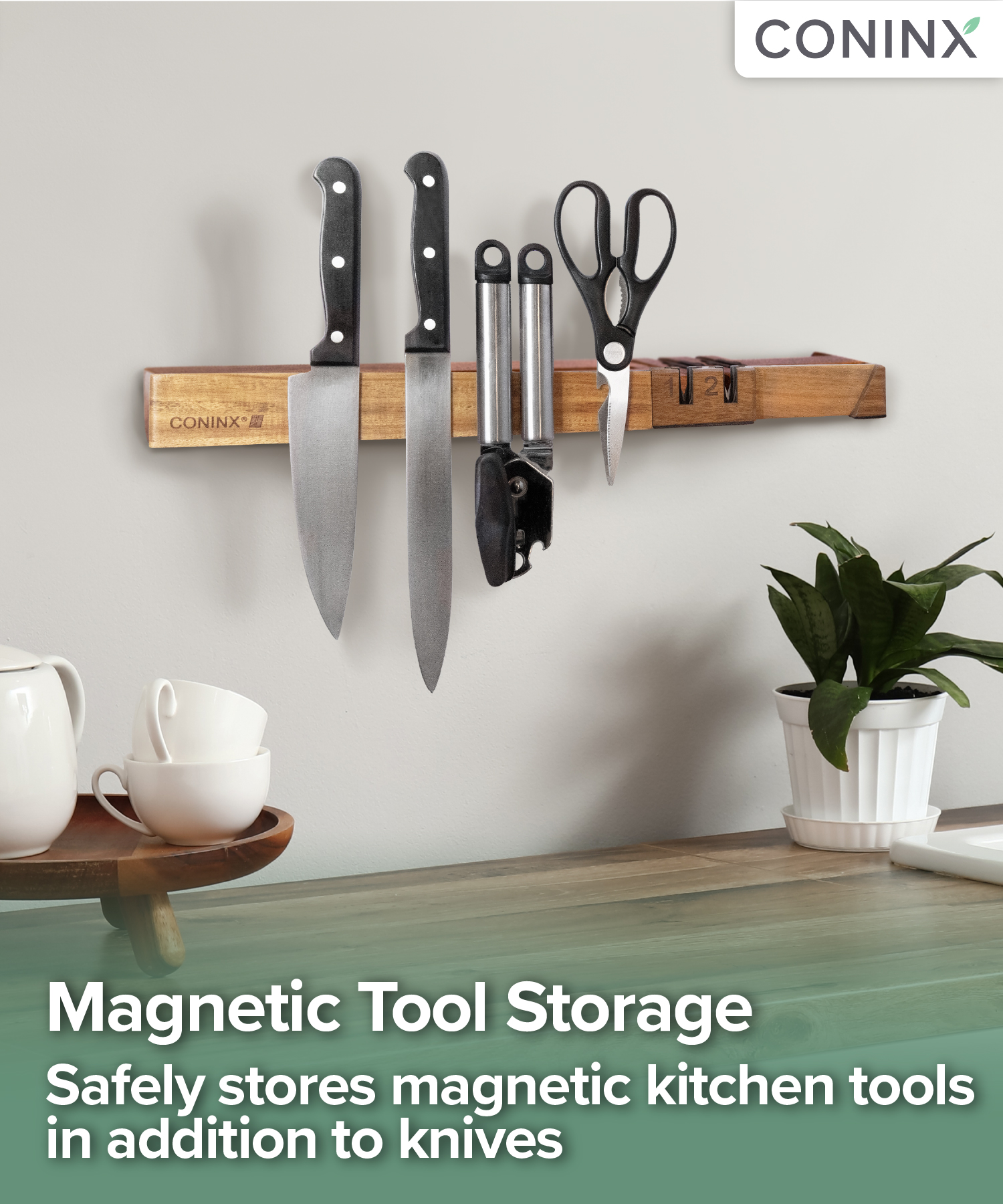 The Coninx Wall Mounted Magnetic Knife Strip with Detachable Sharpener is a multifunctional kitchen essential that blends secure knife storage, effortless sharpening and a clean, modern aesthetic. Handcrafted from rich acacia wood, each strip is unique in grain and finish, bringing both warmth and natural elegance to the kitchen. Designed to maximise space and keep tools beautifully organised, it features strong magnetic zones across the front and centre, securely holding up to 12 knives with confidence. Additional metal utensils such as scissors, peelers or can openers can also be arranged along the front face for quick, easy access.