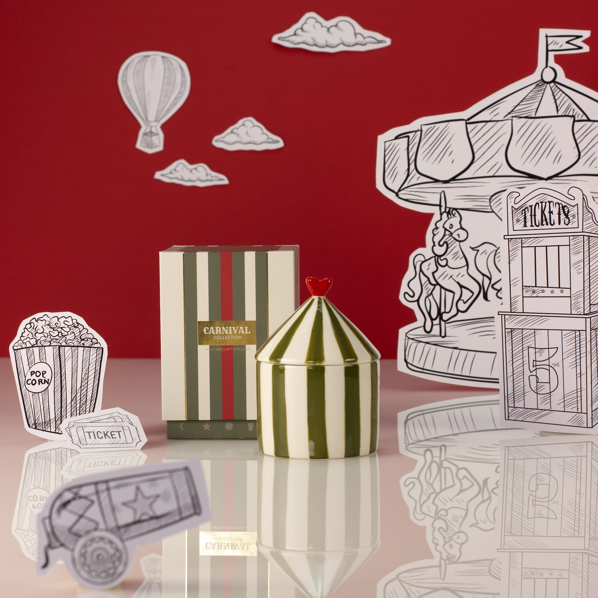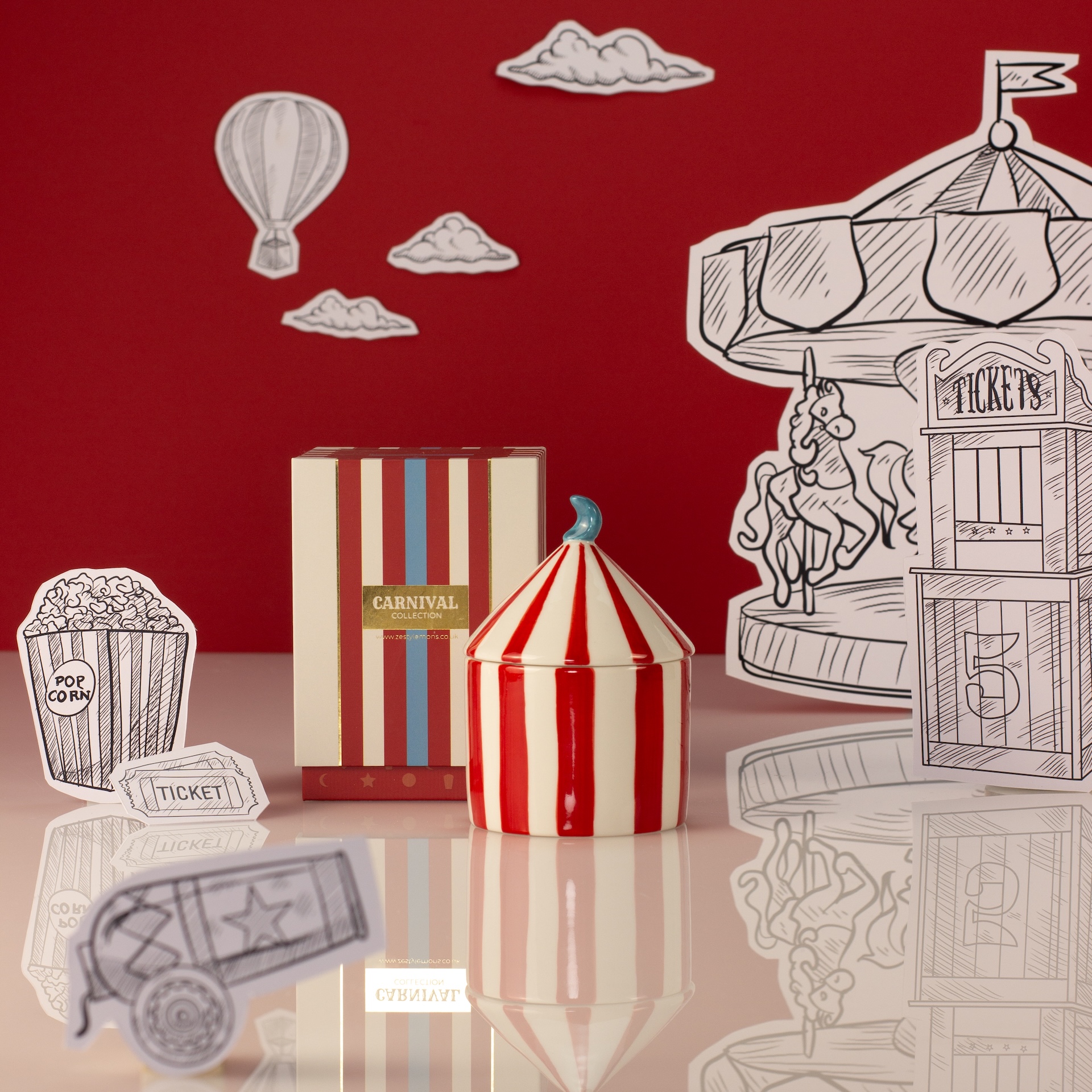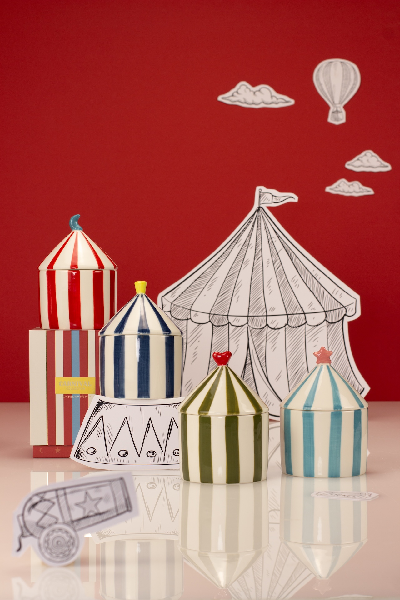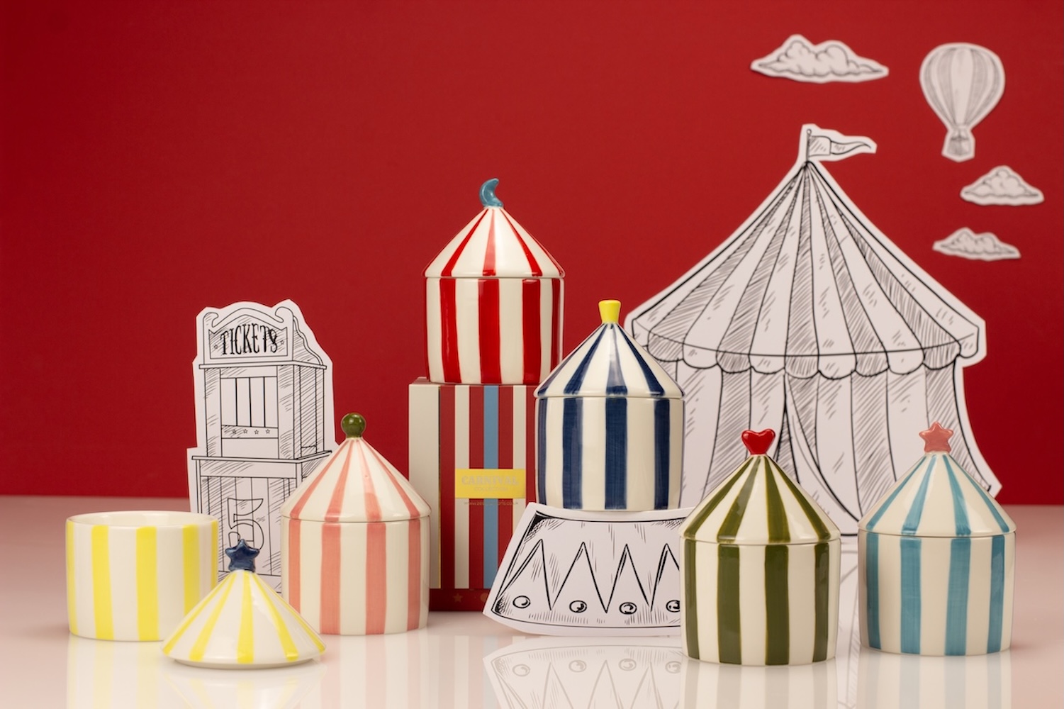 Roll up, roll up and discover the enchanting Carnival Collection, a series of playful ceramic candles designed to delight the senses and brighten any corner of the home. Each candle is housed in a beautiful striped ceramic vessel complete with a circus-tent-inspired lid, making it as much an ornamental keepsake as it is a luxurious home fragrance.