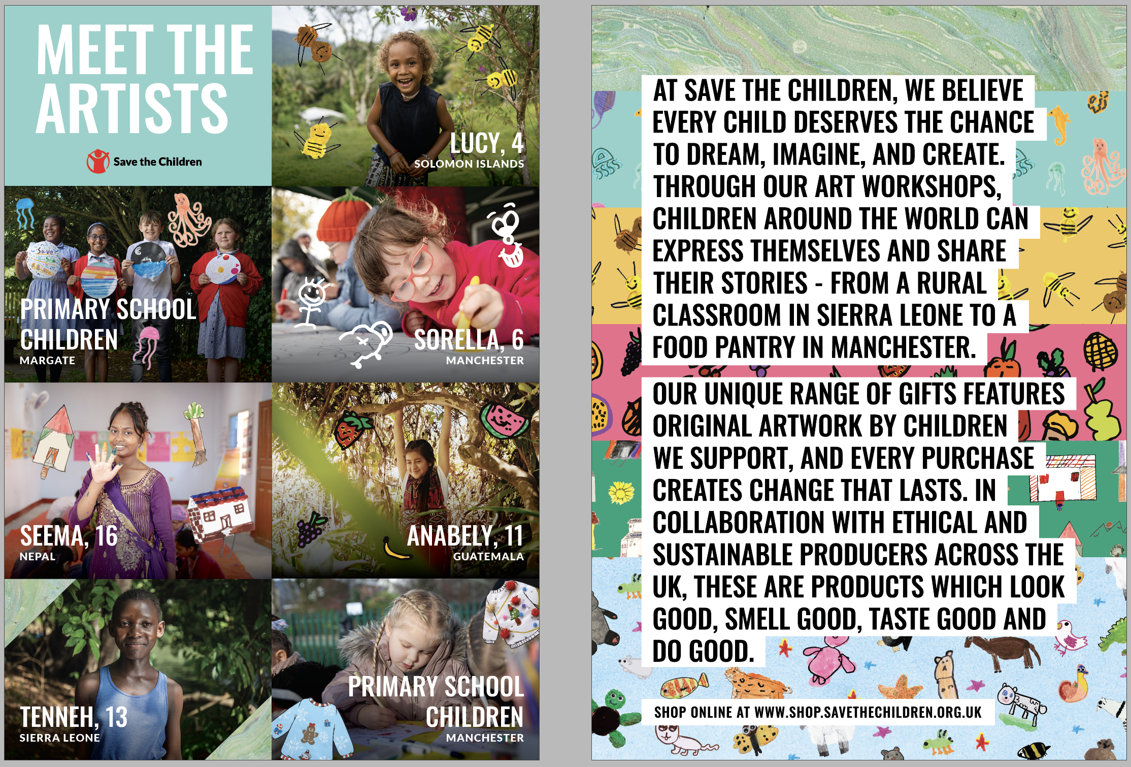 Save the Children builds change that lasts by helping children stay safe, healthy and learning. We do this by working with children directly as well as local communities, whilst also tackling problems like poverty and inequality on a larger scale. Our art workshops are a powerful way of documenting our programming and fostering children’s innate creativity. By featuring original designs by the children we work with on our own-brand gifts, we can help tell their stories in an authentic and emotionally engaging way, whilst raising vital income to help drive our life-changing activities.