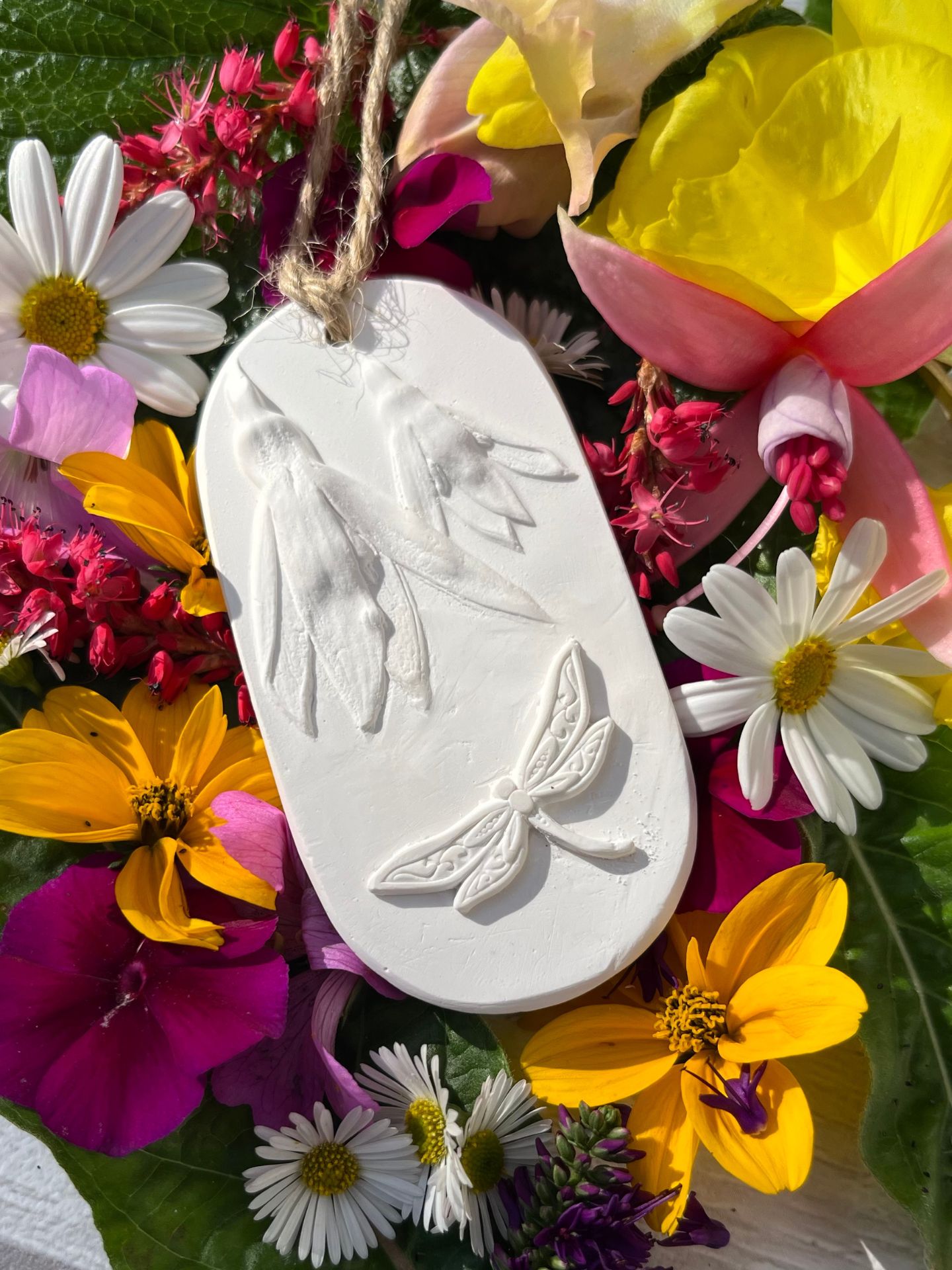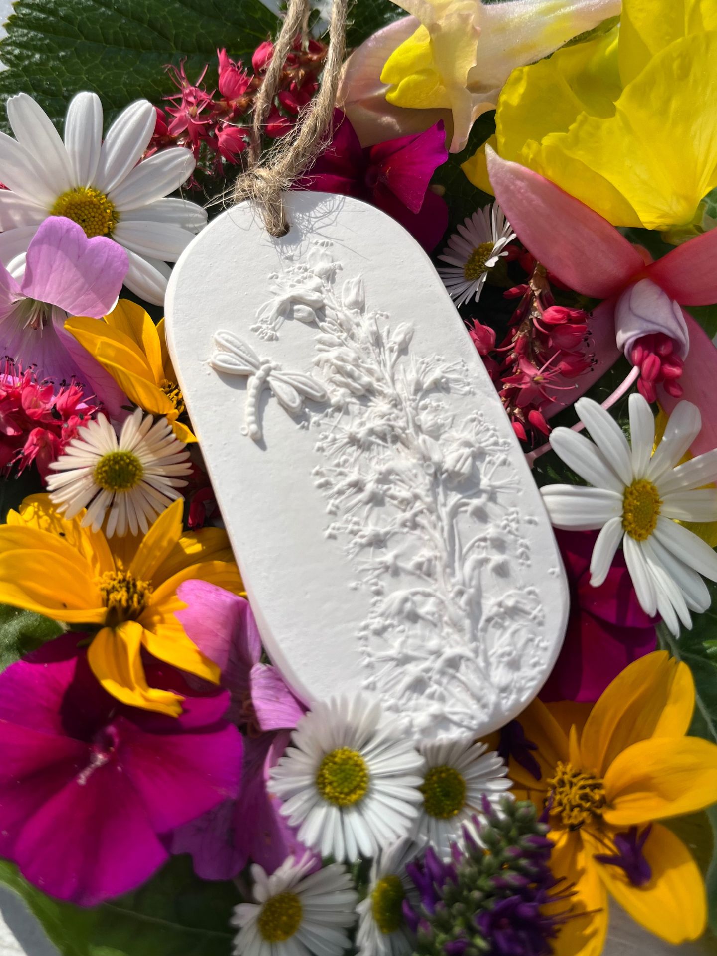 A decorative piece designed to hang in spaces where candles are impractical or unsafe - car dashboards, wardrobes, small offices, hallways, beside beds. Each combines a hand-sculpted dragonfly with botanical casts I create from flowers grown in my own Lincolnshire garden. Every petal vein, every stamen detail captured in permanent natural gypsum plaster.