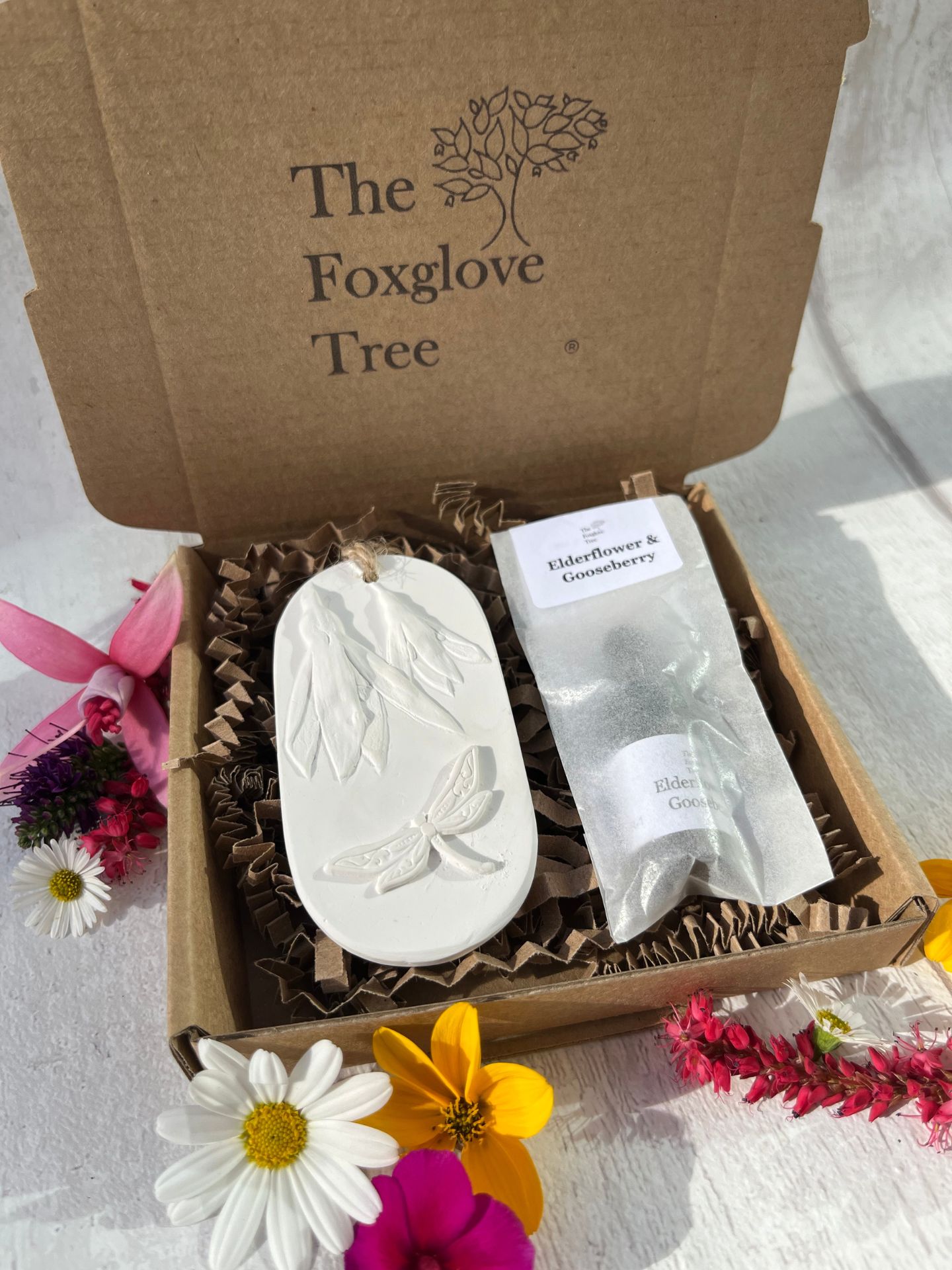 Everything happens in my Lincolnshire workshop. I hand-sculpt each dragonfly design, grow and harvest flowers from my garden, press them into clay to capture every detail, then cast these impressions in plaster. Each diffuser is hand-poured into moulds, hand-finished, and individually infused with fragrance oil before packaging.