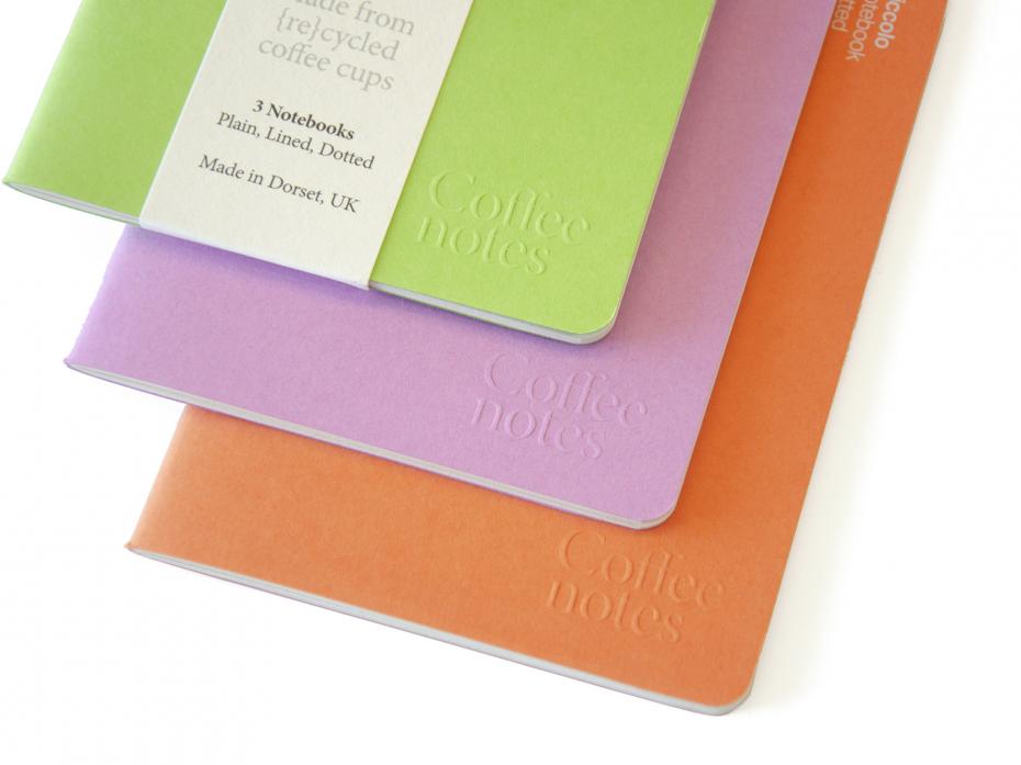Our Pack of 3 Tutti Frutti stitched notebooks are made from recycled coffeecup paper manufactured in Cumbria UK. Each pack contains a lined, a plain and a dotted version in three vibrant colours; Orange, Lilac and Lime Green. Available in four sizes.