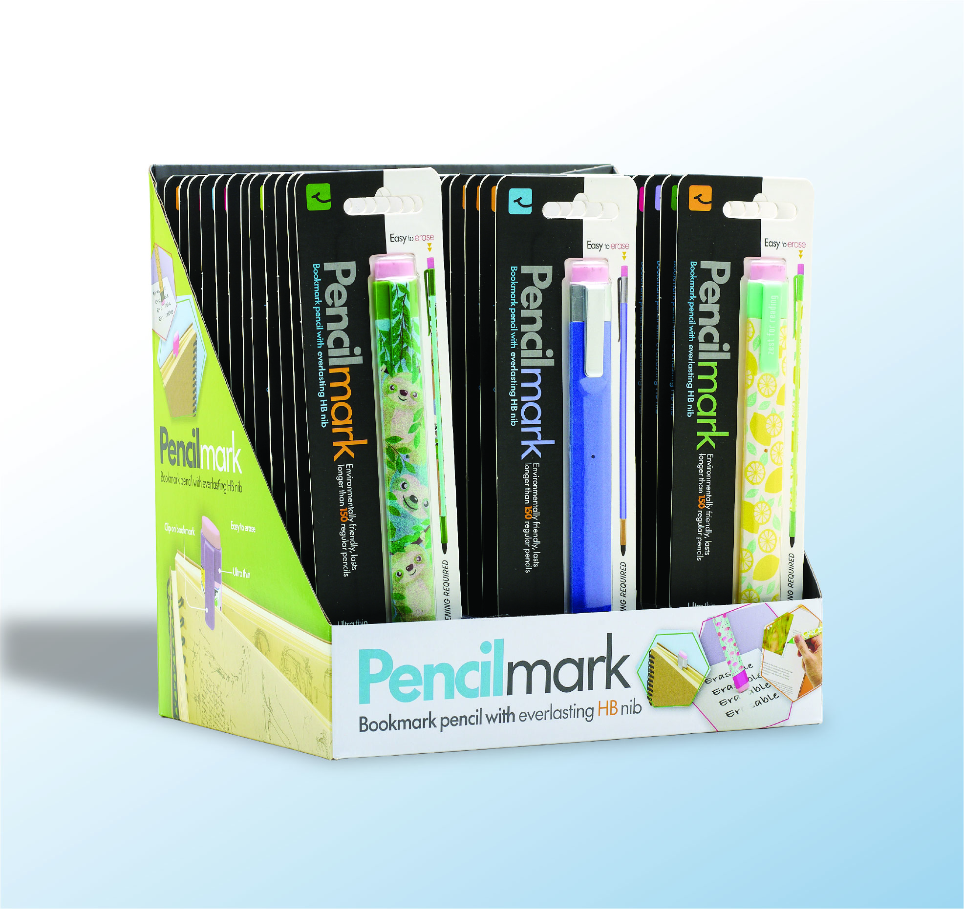 Pencilmark is a bookmark and pencil made with everlasting graphite, which is the same appearance as an HB nib. It is ultra thin, so easily sandwiched between the pages of a book or notebook, and does not require sharpening. The high quality eraser attached, means mistakes can be easily corrected. Elegant packaging and an attractive display make this product a very compelling purchase.